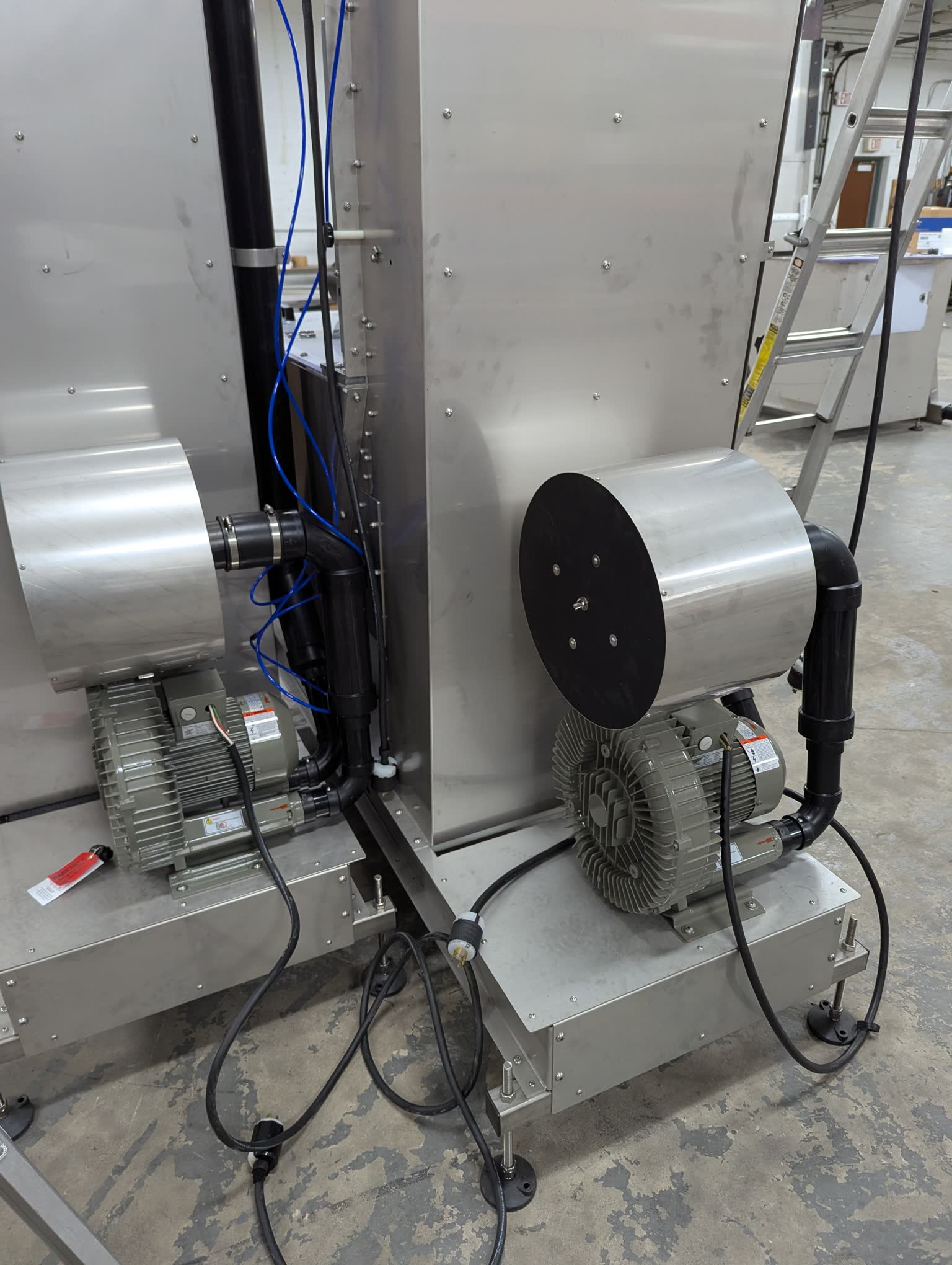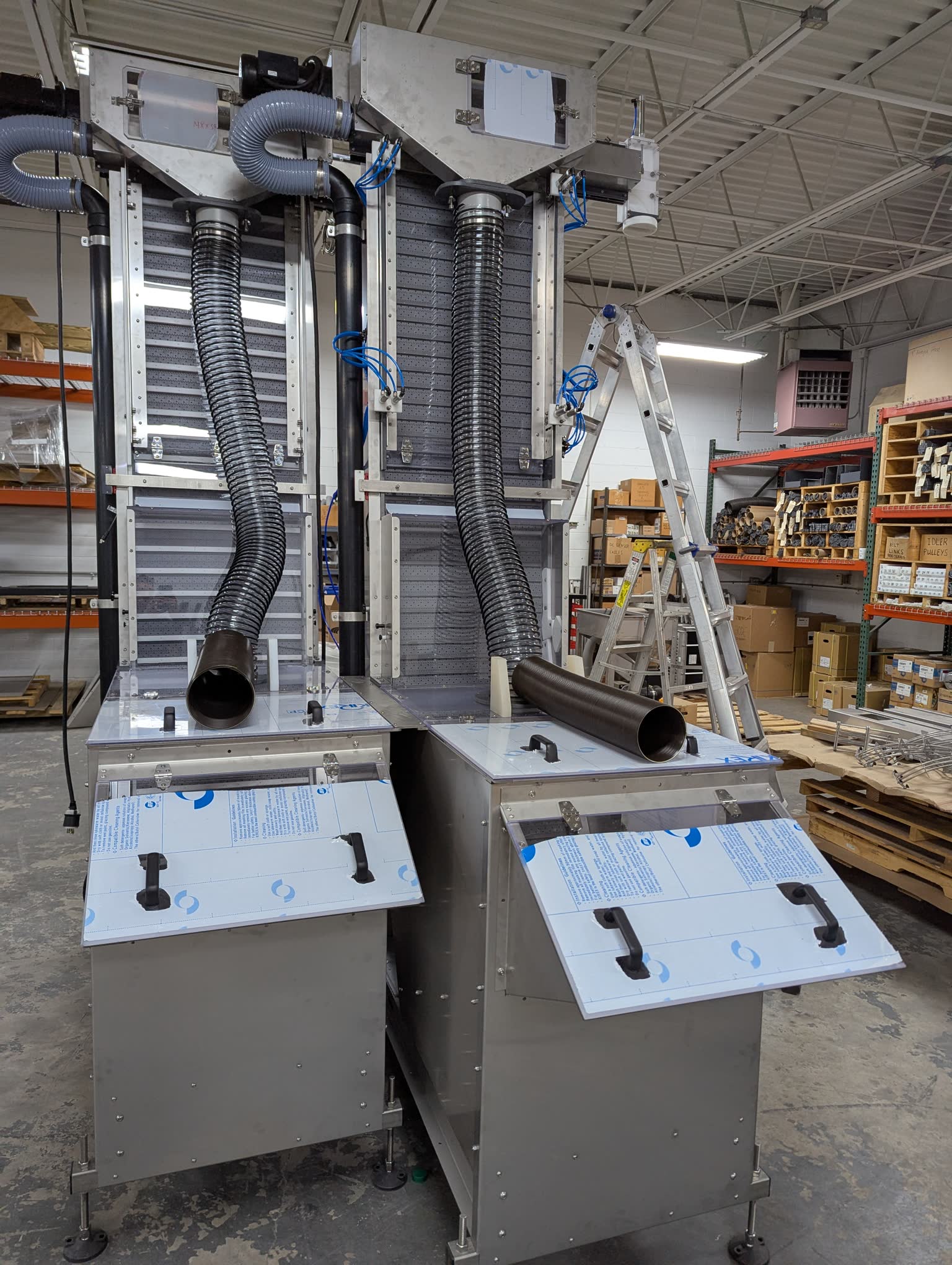 Small footprint dual sorter with rapid hopper empty, auto-adjusting belt cover, and reduced height load stations.
